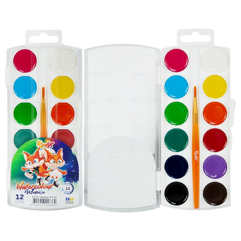 Акварель медовая 12 цветов, с кисточкой RUDIX Лисенята 811207