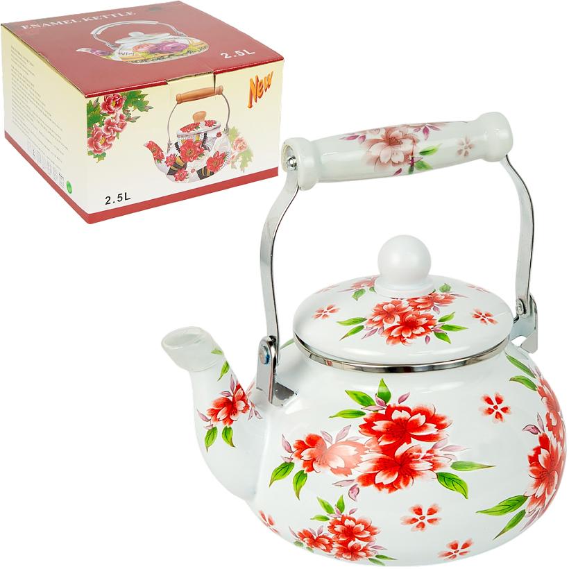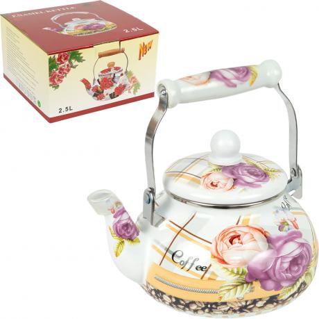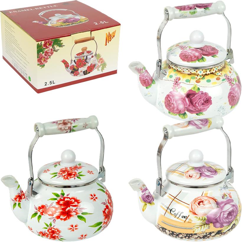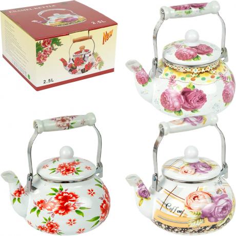 Эмалированный чайник — практичная кухонная посуда для нагрева и кипячения воды. Объем — 2,5 л, диаметр дна — 18 см, диаметр горловины — 12 см, вес — 850 г. Корпус выполнен из металла с эмалированным покрытием, снаружи нанесен декоративный цветочный рисунок, который придает чайнику уютный вид. Чайник оснащен металлической ручкой с керамической вставкой, ручка на крышке из пластика. Крышка съемная, что делает использование и уход более удобными. Подходит для всех типов плит. Чайник упакован в коробку размером 22×21×12,5 см. Цена указана за 1 единицу товара. Товар выгодный для оптовых магазинов и подходит для розничной продажи.