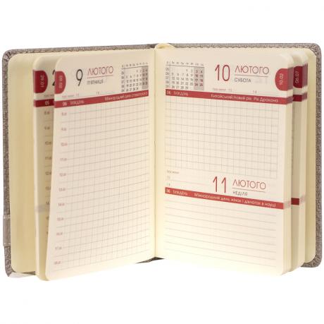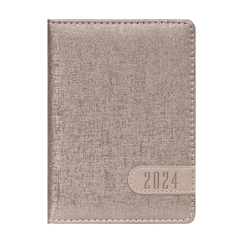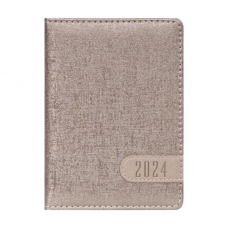 Ежедневник формата А6 для 2024 года с 160 листами кремового цвета, плотностью 70 г/м2. Блок выполнен в двух цветах, с клетчатым рисунком. Обложка изготовлена из искусственной кожи, имеет округленные углы. В комплекте идет кремовая закладка. Форзац без печати, кремового цвета.