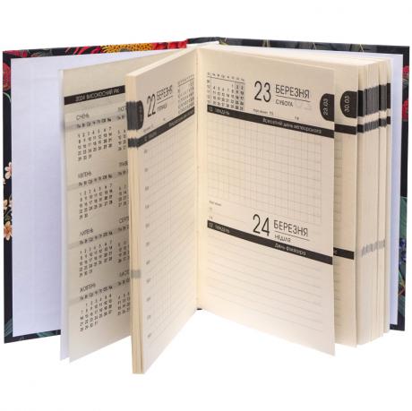 Ежедневник датированный на 2024 год, размером 105х148 мм, с 160 листами. Обложка выполнена из переплетного картона 1,75 (производство Украина) и покрыта матовой ламинацией. Внутренний блок изготовлен из книжно-журнальной бумаги 60г/м2 с клетчатым рисунком, пухлость 1,8. Печать выполнена в 4+0 цветах на обложке и 1+1 CMYK внутри. Корешок книги круглый.