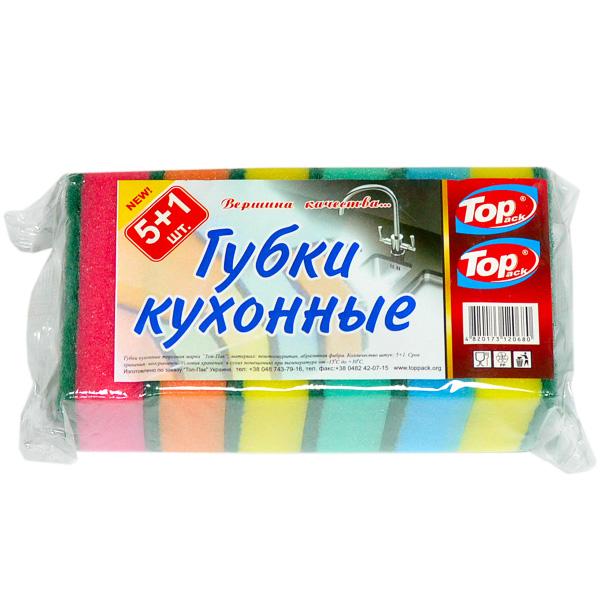 Губка для миття посуду Top Pack №5+1. Кухонные губки для посуды предназначены для мытья посуды, столовых приборов, а также различных поверхностей, мебели, оборудования, бытовой техники и т.д. Удобны в использовании, практичны и многофункциональны. Губки для посуды способны впитывать в себя моющее средство, равномерно распределяя его по поверхности – это свойство позволяет более экономно расходовать моющее средство. Размер губки: 9х6х3 см