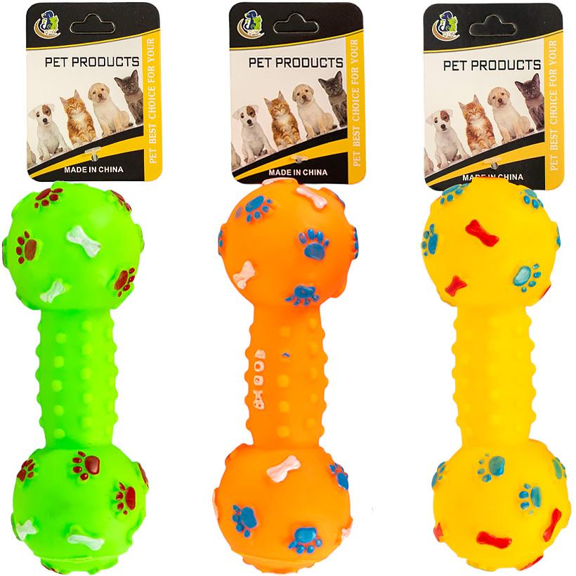 Игрушка для собак в форме яркой гантели — идеальный аксессуар для активных игр и укрепления здоровья питомца. Изготовлена из прочной, нетоксичной резины с фактурной поверхностью, которая помогает массировать дёсны и очищать зубы во время жевания. Украшена рельефными рисунками лапок и косточек, которые придают игрушке привлекательный вид. Оснащена встроенной пищалкой, стимулирующей интерес и игровую активность у собак.