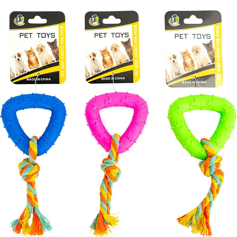 Канатная игрушка для собак в форме треугольника — отличный выбор для активных игр, жевания и перетягивания. Длина: 17 см. Изготовлена из прочного хлопкового каната, безопасного для зубов и дёсен питомца. Плотное плетение помогает очищать зубы и укреплять челюсти во время игры. Яркие цвета делают игрушку привлекательной для собак. Подходит для мелких и средних пород. Идеальна для оптовой торговли — выгодное решение для зоомагазинов и интернет-продаж.