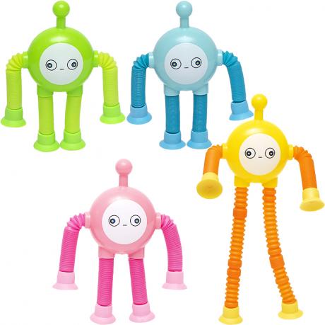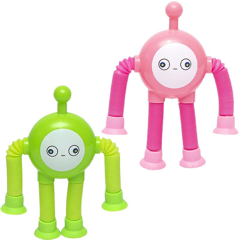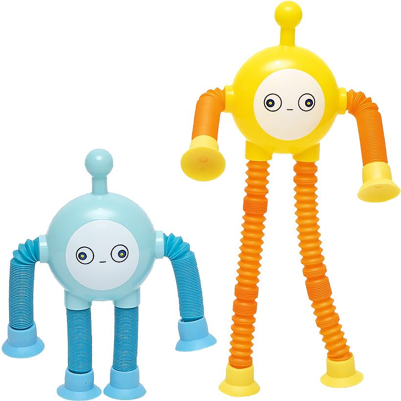 Телескопическая игрушка Шарик с присосками изготовлена из пластика. Конечности выполнены из гибких трубок, которые можно вытягивать и деформировать. Размер в сжатом состоянии составляет 14 см x 15 см x 3,5 см. В расширенном состоянии размер достигает 42 см x 29 см x 3,5 см.