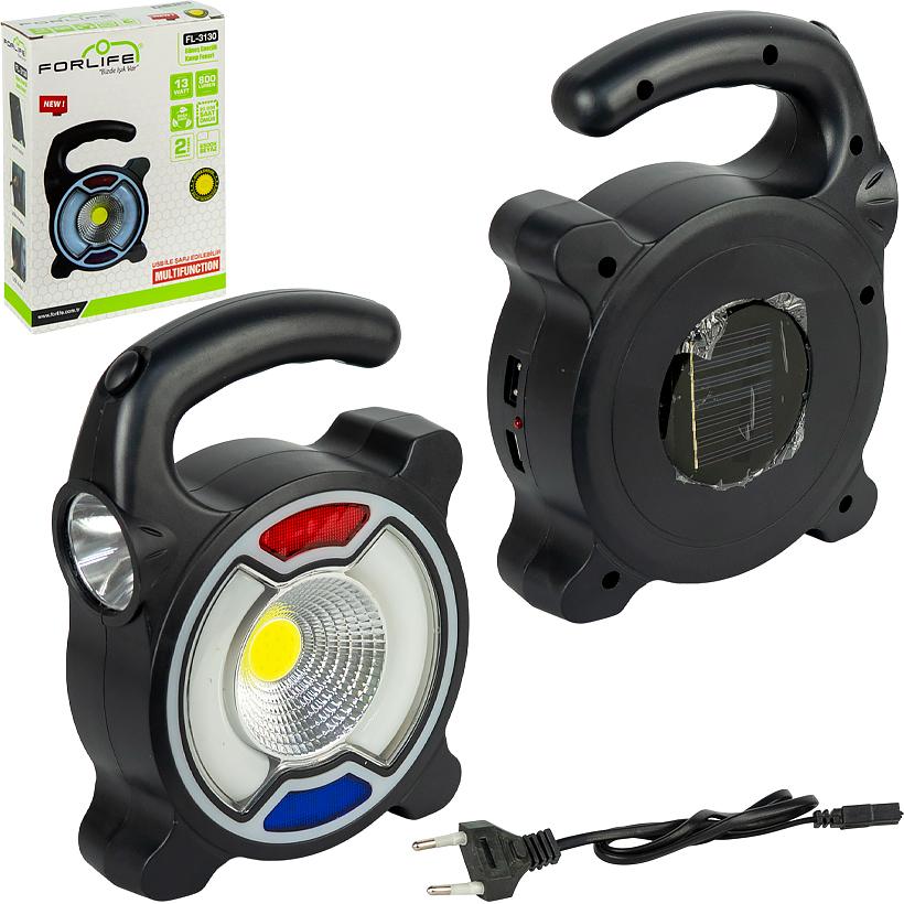 Ручной кемпинговый фонарь Forlife FL-3130 — мощное, водонепроницаемое устройство с солнечной панелью, встроенным аккумулятором 2800 мАч, световым потоком 800 лм и мощностью 13 Вт. Обеспечивает белое освещение 6500K, имеет режим красно-синего стробоскопа, USB-зарядку и USB-выход — можно использовать как пауэрбанк. Благодаря защите IP67, подходит для использования на улице в любую погоду. Эргономичная ручка облегчает переноску. Размер: 125×155 мм, вес — 300 г, упаковка — 14×18,5×5,5 см. Отличное решение для кемпинга, рыбалки, путешествий или экстренных ситуаций.