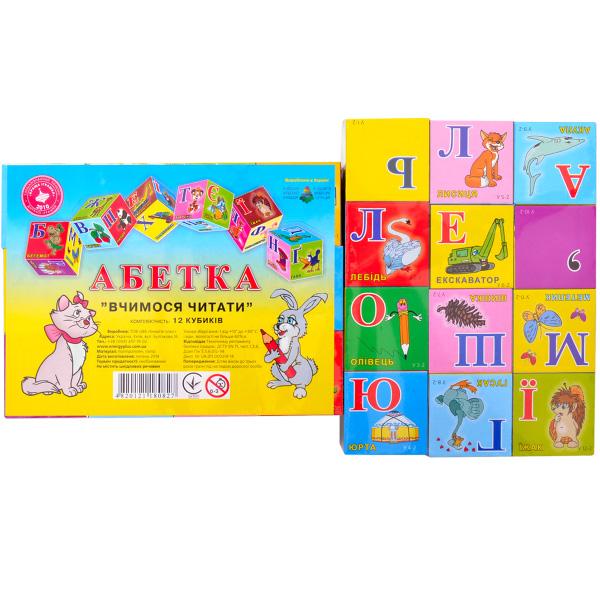 На кубиках изображены буквы украинского алфавита и картинки, названия которых начинаются на эту букву, а также знак апостроф. Запаяны в целофан. Размер одного кубика: 4х4х4 см Комплектация: 12 кубиков.