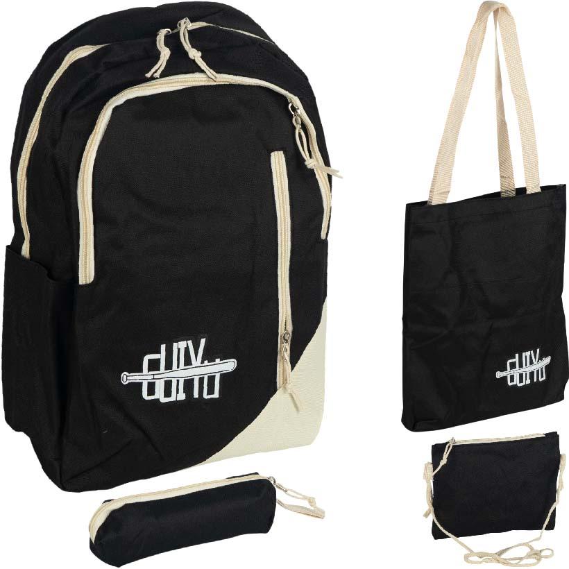 Набор 4 в 1 включает рюкзак, сумку на плечо, косметичку и пенал. Рюкзак имеет размеры 43×30×14 см, сумка — 33×31×6 см, косметичка — 21×17 см, пенал — 18×8 см. Изготовлены из водоотталкивающего материала. Доступны в различных цветах. Подходит для использования в школе, университете и в повседневной жизни.
