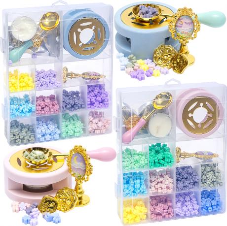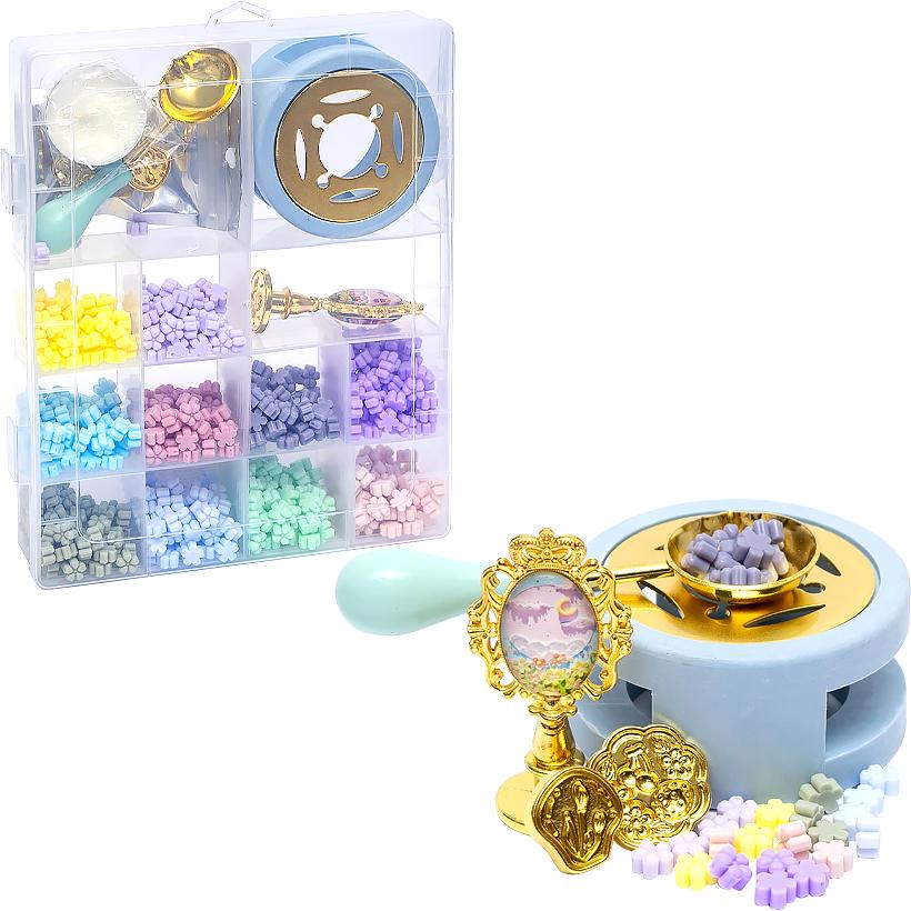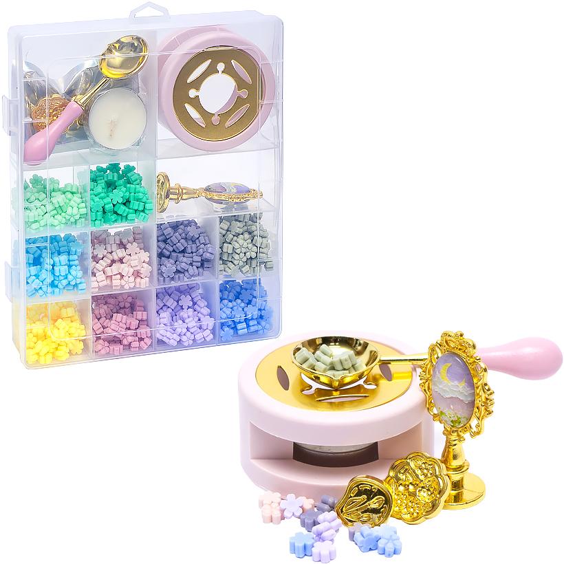 Этот набор предназначен для создания сургучных отпечатков, которые можно использовать для декора конвертов, подарков и альбомов. В комплект входят гранулы для изготовления сургуча в 10 различных цветах (по 15 грамм каждого), парафиновая свеча, ложечка и подставка для плавления сургуча, а также металлическая сургучная печать с тремя сменными отпечатками.
