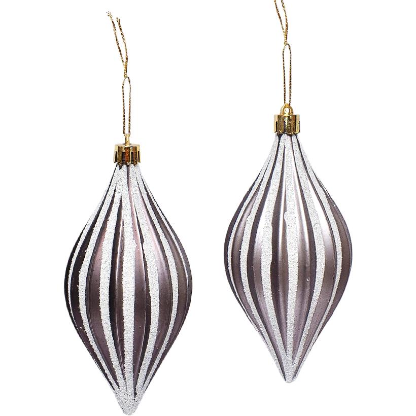 Набор включает 2 елочные игрушки. Изготовлены из пластика с глиттером, имеют глянцевую и матовую поверхность. Размер каждой игрушки составляет 13*6 см. Упакованы в пластиковую коробку. Цена указана за набор из 2 штук.