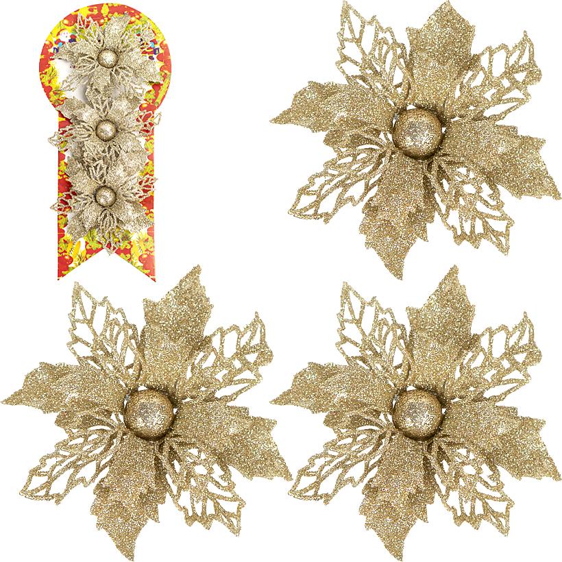 Набор включает три новогодних украшения размером 11х11 см. Изготовлены из пластика и имеют золотой цвет. Крепление осуществляется с помощью зажима. Цена указана за весь набор.