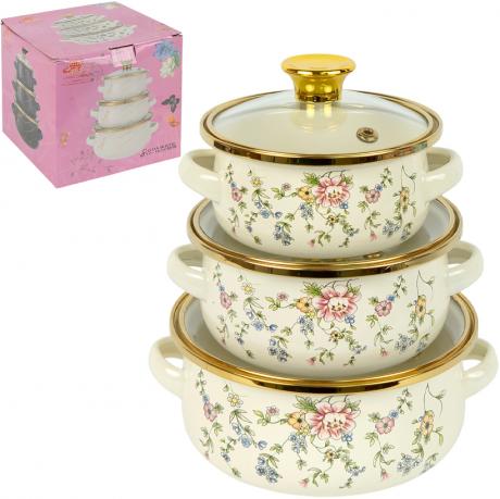 Набор эмалированных кастрюль предназначен для приготовления и подогрева различных блюд. В комплект входит 3 кастрюли с ручками объемом 1100 мл, 700 мл и 400 мл. Диаметр кастрюль составляет 16 см, 14 см и 12 см соответственно. Изготовлены из металла с эмалированным покрытием, снаружи нанесен декоративный рисунок. Кастрюли дополнены аккуратной каемкой по краю. В комплект входят стеклянные крышки со съемными ручками, что удобно при использовании и хранении. Размер коробки — 16×15×16 см. Набор подходит для приготовления небольших порций и повседневного использования на кухне. Цена указана за набор. Товар выгодный для оптовых магазинов и подходит для розничной продажи.