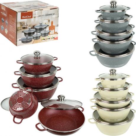 Набор кастрюль HotChef с антипригарным покрытием – это современная и удобная посуда для ежедневного использования. Изготовленный из качественных материалов, он сочетает долговечность, практичность и стиль.
