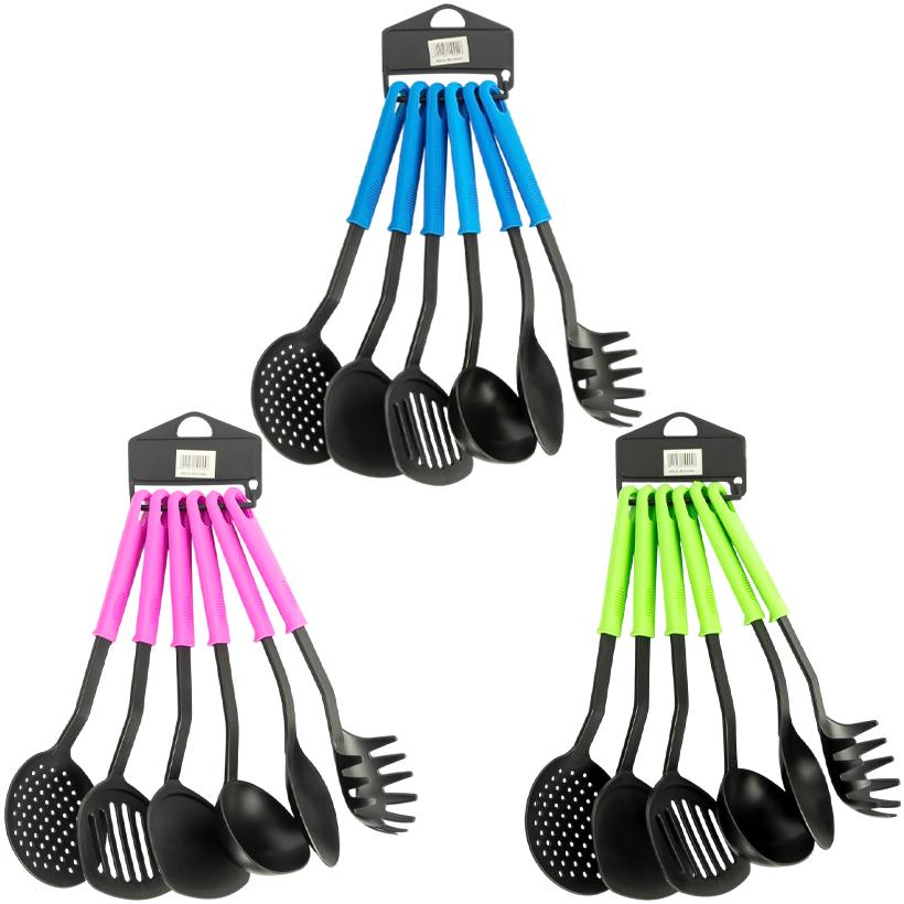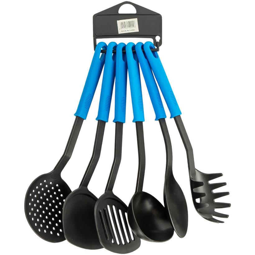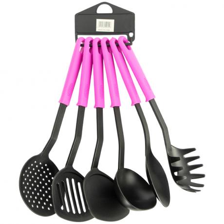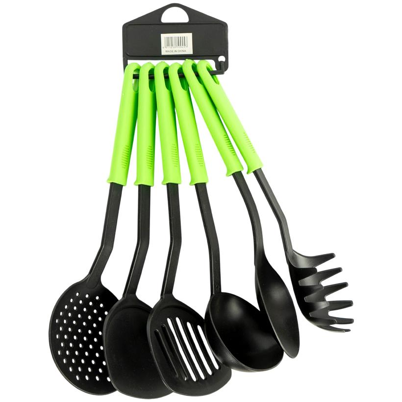 Набор кухонных принадлежностей — удобное решение для приготовления пищи в домашних условиях. Длина каждого предмета — 32 см. В комплект входят половник, шумовка, ложка, ложка с прорезями, лопатка, ложка для пасты и сервировочная ложка. Рабочая часть выполнена из термостойкого пластика, ручки — пластиковые. Подходят для работы с горячими блюдами и использования с антипригарной посудой, не повреждая покрытие. Все предметы имеют удлиненные ручки с отверстиями для подвешивания. Цена указана за набор. Товар выгодный для оптовых магазинов и подходит для розничной продажи.