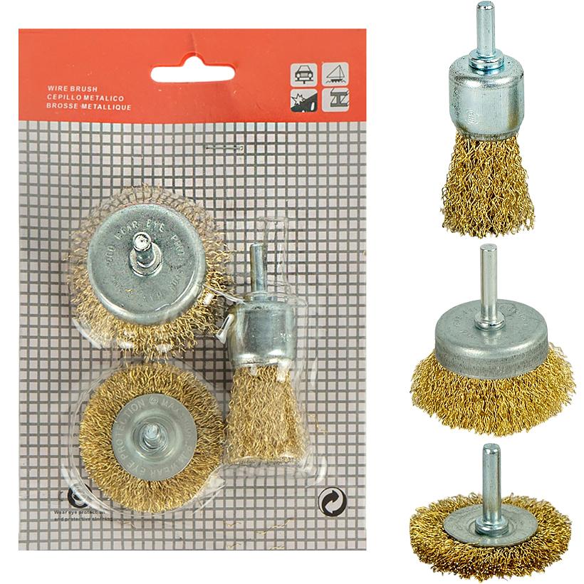 Набор металлических щеток-насадок для дрели предназначен для очистки поверхностей от ржавчины, краски и загрязнений при ремонтных и слесарных работах. В комплект входят 3 насадки разных форм: чашечная, дисковая и кистевая, что позволяет обрабатывать плоские поверхности, кромки и труднодоступные места. Рабочая часть выполнена из металлической проволоки. Щетки подходят для использования с дрелью и другим электроинструментом с соответствующим зажимом. Поставляются в блистерной упаковке 17,5х12 см. Цена указана за набор. Товар выгодный для оптовых магазинов и подходит для розничной продажи.