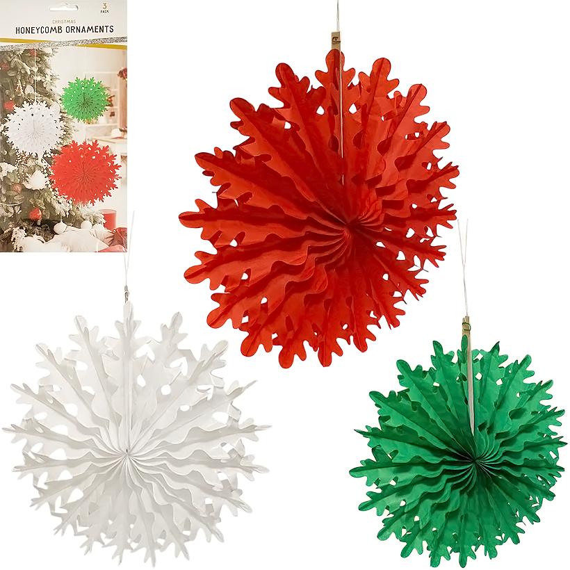 Набор подвесных украшений Honeycomb “Снежинка” включает 3 бумажных элемента диаметром 30, 40 и 50 см. Украшения выполнены в праздничных цветах — белом, красном и зелёном, в технике «соты», что создаёт лёгкий и объёмный вид. В комплекте 6 скрепок. Упаковка:30*14см.Такие снежинки подойдут для оформления дома, офиса, витрин или праздничных залов, добавляя интерьеру торжественности и уюта.