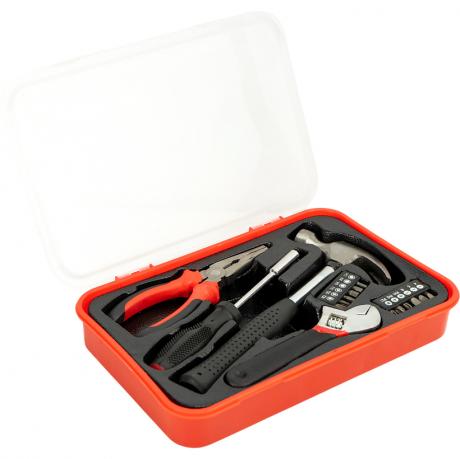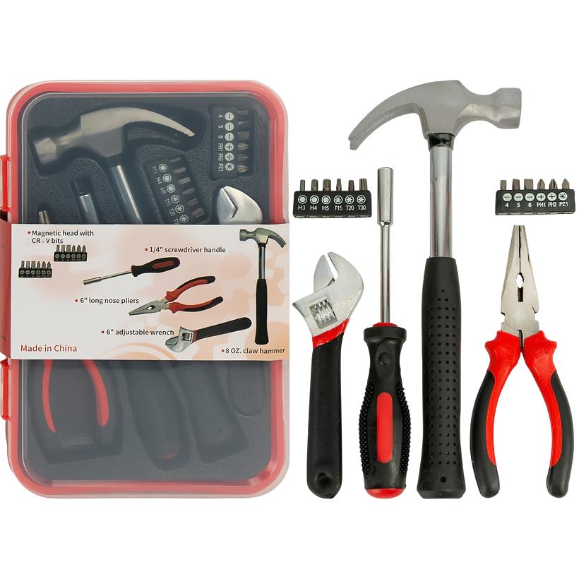 Набор инструментов в кейсе предназначен для выполнения бытовых и монтажных работ и включает основные инструменты для повседневного использования. В комплект входят молоток — 24,5, плоскогубцы — 15 см, разводной ключ — 15 см, отвертка 19 см с набором сменных бит. Рабочие части изготовлены из углеродистой стали, обеспечивают надежность и устойчивость к нагрузкам. Инструменты оснащены обрезиненными ручками, которые удобно лежат в руке и предотвращают скольжение. Пластиковый кейс упрощает хранение и транспортировку, его размер 28×18×4,5 см. Цена указана за набор. Товар выгодный для оптовых магазинов и подходит для розничной продажи.