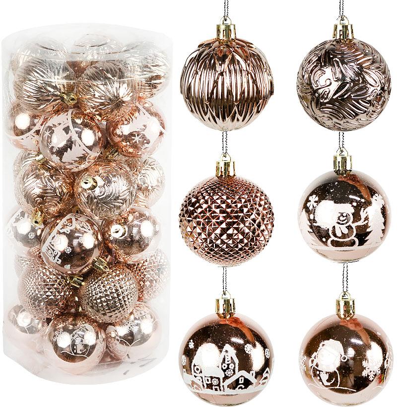 Набор шаров — элегантное украшение для праздничного декора. В комплекте 30 шариков диаметром 6 см: 15 с рисунком (3 вида) и 15 рельефных (3 вида). Все шары имеют глянцевую поверхность, красиво отражающую свет и создающую торжественное сияние. Ниточки для подвешивания идут отдельно. Упакованы в тубус диаметром 16 см и высотой 31 см, удобный для хранения и подарочного оформления.