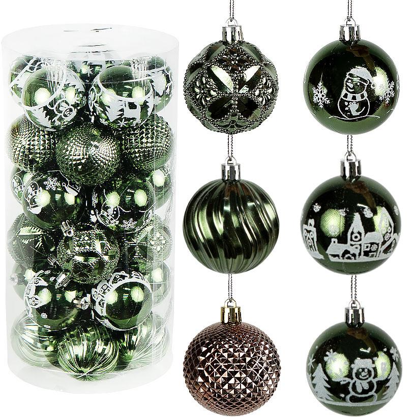 Набор шаров — элегантное украшение для праздничного декора. В комплекте 30 шариков диаметром 6 см: 15 с рисунком (3 вида) и 15 рельефных (3 вида). Все шары имеют глянцевую поверхность, красиво отражающую свет и создающую торжественное сияние. Ниточки для подвешивания идут отдельно. Упакованы в тубус диаметром 16 см и высотой 31 см, удобный для хранения и подарочного оформления.