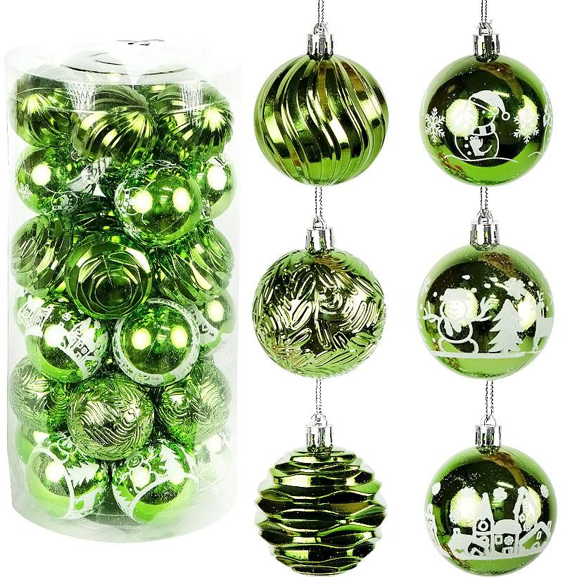 Набор шаров — элегантное украшение для праздничного декора. В комплекте 30 шариков диаметром 6 см: 15 с рисунком (3 вида) и 15 рельефных (3 вида). Все шары имеют глянцевую поверхность, красиво отражающую свет и создающую торжественное сияние. Ниточки для подвешивания идут отдельно. Упакованы в тубус диаметром 16 см и высотой 31 см, удобный для хранения и подарочного оформления.