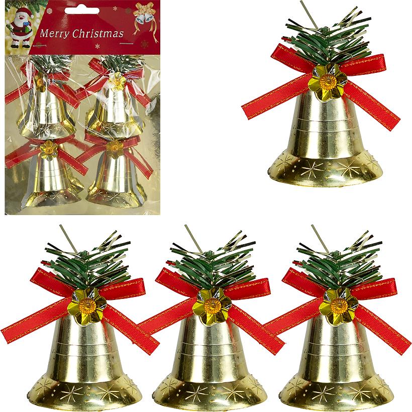 Набор золотых колокольчиков с декором на блистере, 4 штуки. Размер одного колокольчика составляет 5 см на 4,5 см. Изготовлены из пластика.