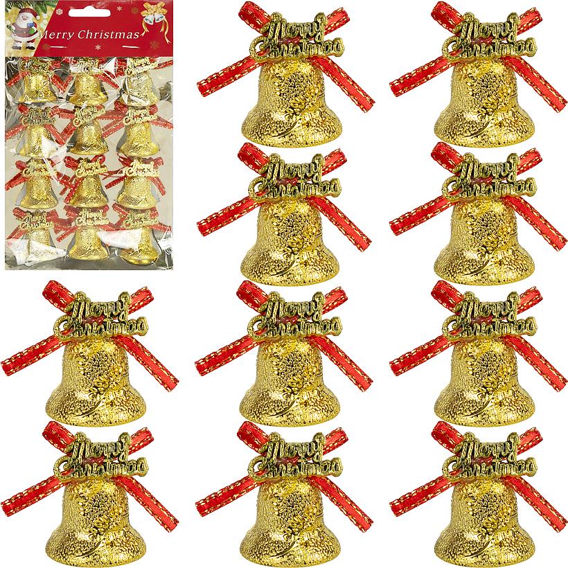 Набор включает 12 золотых пластиковых колокольчиков с декоративными бантиками. Каждый колокольчик имеет размеры 2×2,5 см. Цена применяется к одной упаковке.