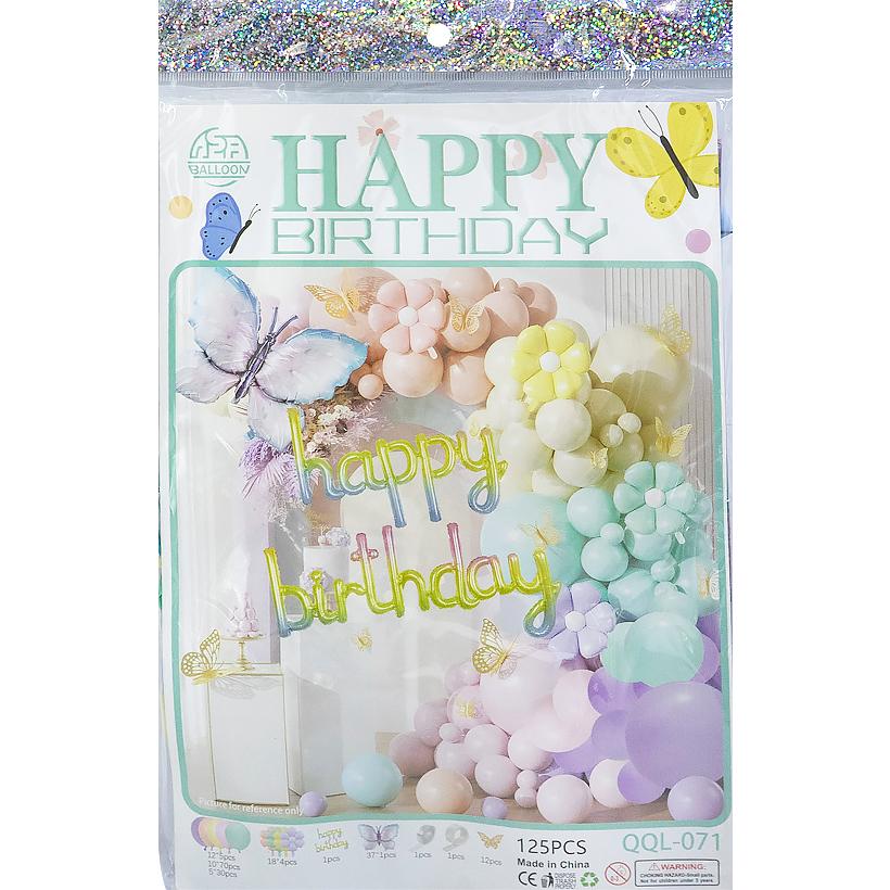 Набор воздушных шаров для оформления нежной фотозоны включает шары разных диаметров и оттенков: 12" — 5 шт, 10" — 70 шт (разные цвета), 5" — 30 шт. В комплект также входят 4 фольгированных шара-цветка диаметром 18 см, надпись Happy Birthday, декоративная бабочка размером 37 см, лента для крепления, рулон клеевых точек и набор золотых бабочек (12 шт). Такой набор позволяет легко создать яркую и объёмную композицию для дня рождения или праздничной фотозоны.