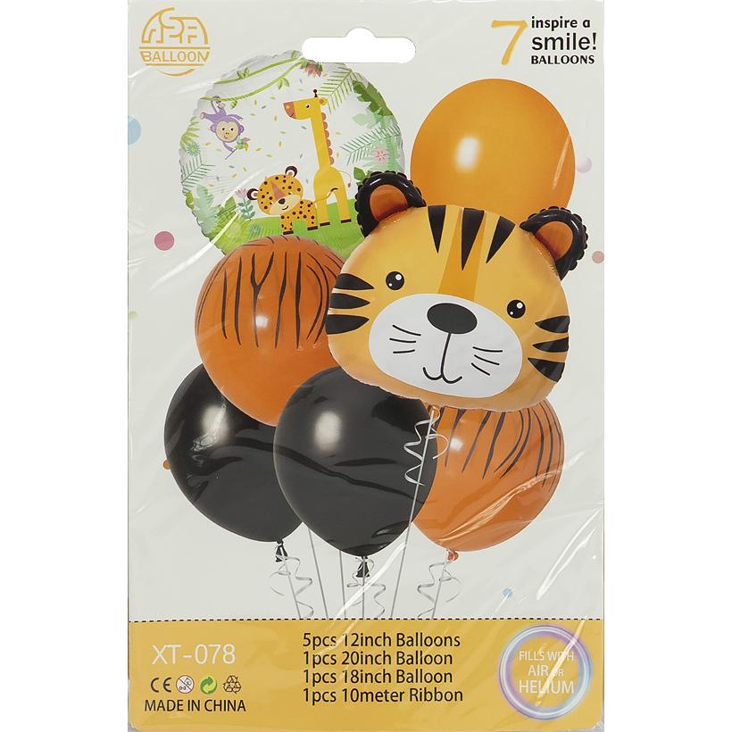 Набор шаров для праздника включает 7 элементов: 5 латексных шаров 12" (30 см), 1 фольгированный круглый шар 20" (50 см) с джунглями, 1 фольгированный фигурный шар «Тигрёнок» 18" (45 см) и ленту длиной 10 м. Яркий комплект отлично подходит для оформления дня рождения, фотозоны, детского праздника и тематической вечеринки в стиле джунглей. Шары можно наполнять воздухом или гелием, создавая эффектный декоративный акцент.