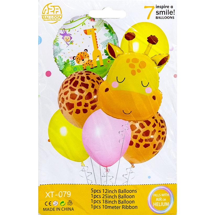 Набор шаров для праздника включает 7 элементов: 5 латексных шаров 12" (30 см), 1 фольгированный круглый шар 25" (63 см) с джунглями, 1 фольгированный фигурный шар «Жирафик» 18" (45 см) и ленту длиной 10 м. Яркий комплект отлично подходит для оформления детского праздника, дня рождения, фотозоны и тематической вечеринки в стиле сафари. Шары можно наполнять воздухом или гелием, создавая эффектную декоративную композицию.