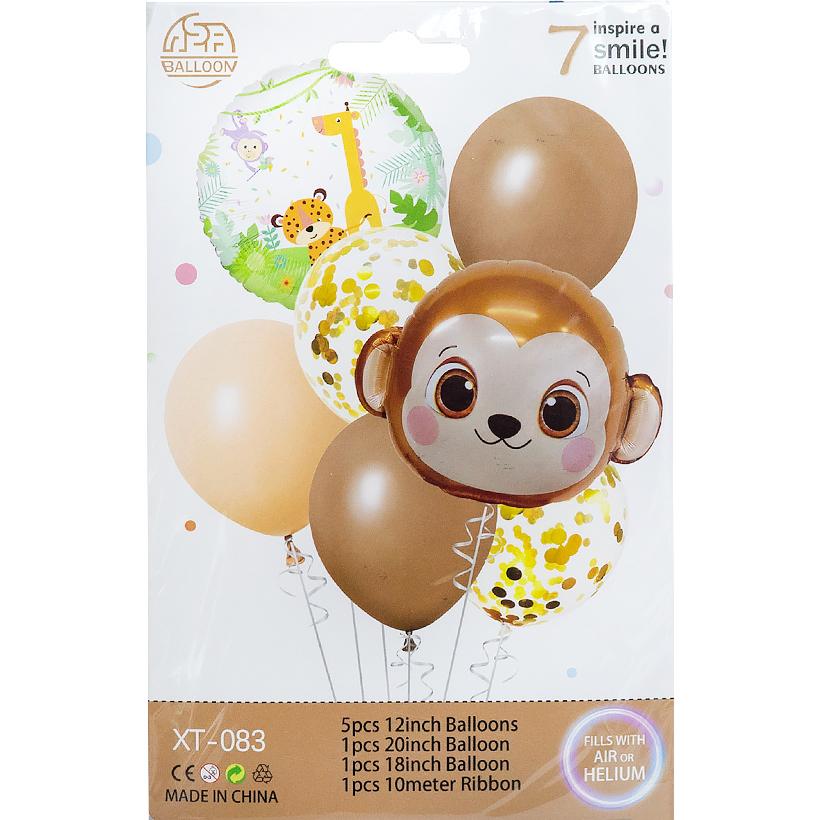 Набор шаров включает 7 элементов: 5 латексных шаров 12", 1 фольгированный круглый шар 20", 1 фольгированный шар 18" и ленту длиной 10 м. В центре — фигурный шар в виде милой обезьянки, который отлично дополняет композицию в природной и детской тематике. Набор подходит для оформления дня рождения, детского праздника, фотозоны и тематических вечеринок. Подходит для наполнения воздухом или гелием.
