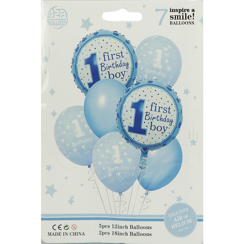 Набор шаров включает 7 элементов: 5 латексных шаров 12" и 2 фольгированных круглых шара 18" с надписью First Birthday Boy. Голубая цветовая гамма делает комплект идеальным для празднования первого дня рождения мальчика, оформления фотозоны, детской вечеринки или тематического декора. Шары подходят для наполнения воздухом или гелием.