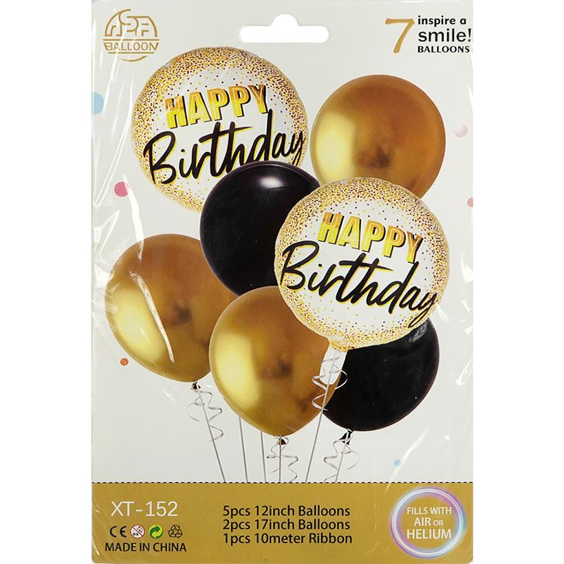 Набор шаров включает 7 элементов: 5 латексных шаров 12", 2 фольгированных круглых шара 17" с надписью Happy Birthday, а также ленту длиной 10 м. Стильная черно-золотая палитра делает комплект идеальным для оформления дня рождения, фотозоны, вечеринки и праздничного декора. Шары подходят для наполнения воздухом или гелием.