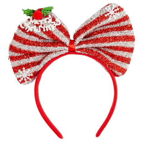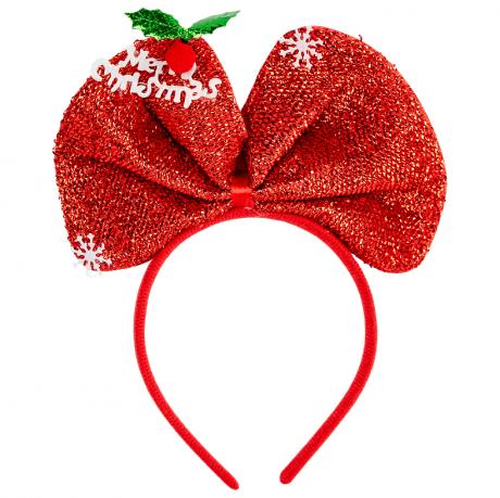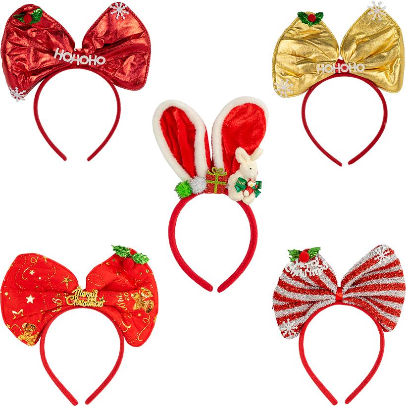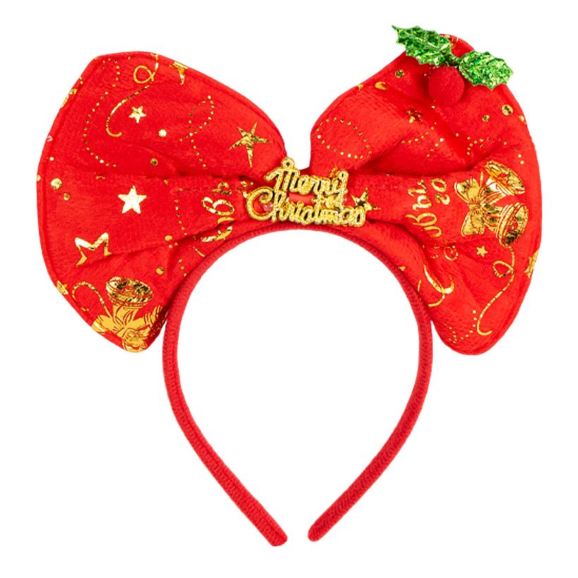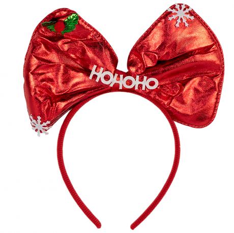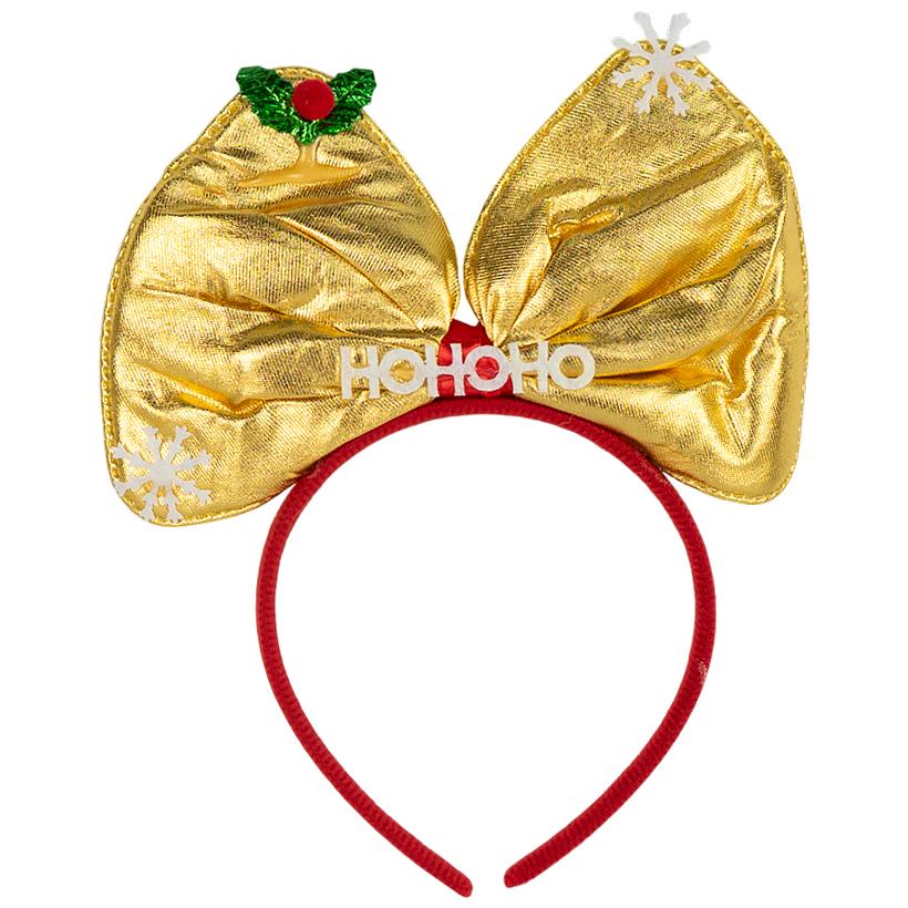 Праздничный ободок с большим блестящим бантом в красном или золотом цвете, украшенный снежинками и надписью “HoHoHo”. Размер: 24×19 см. Лёгкий и удобный аксессуар отлично держится на голове и создаёт яркое настроение. Идеально подходит для новогодних вечеринок, корпоративов, утренников и фотосессий, добавляя образу игривости и праздничного блеска.