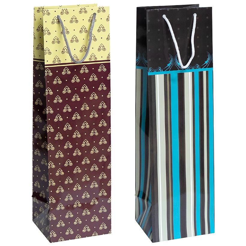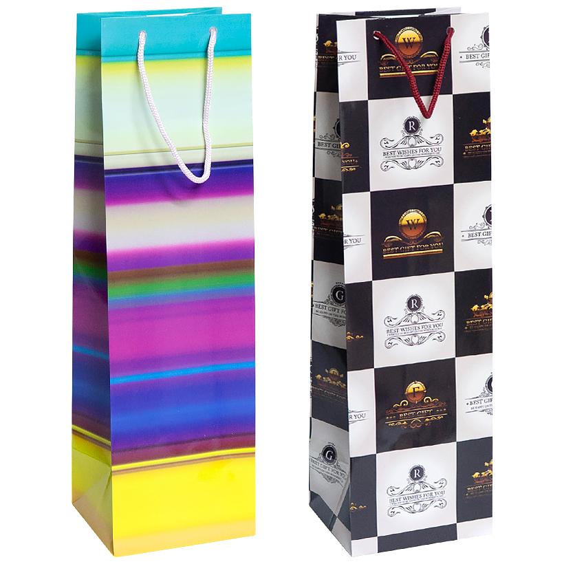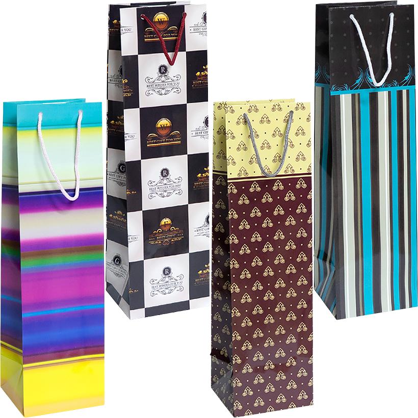 Подарочный пакет "Бутылка" с глянцевой поверхностью. Размер 12х39х9 см. В комплекте 12 штук. Цвета в ассортименте. Ручки выполнены в виде шнурка.