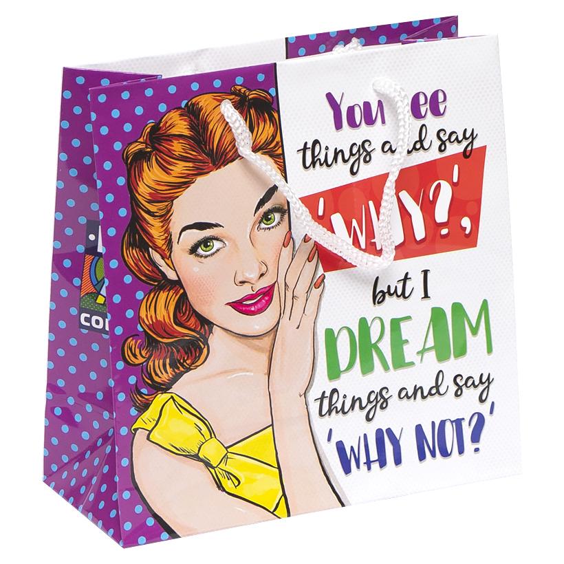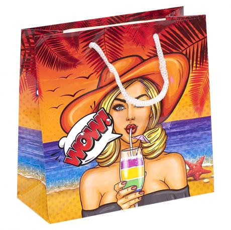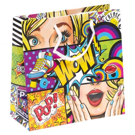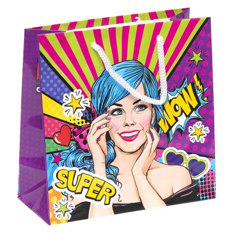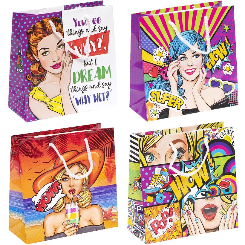 Это подарочный пакет с глянцевой поверхностью и шнурковыми ручками. Дизайн выполнен в стиле Поп-Арт. Размер пакета составляет 16х16х7 см. В одной упаковке идет 12 пакетов с 4 разными картинками.