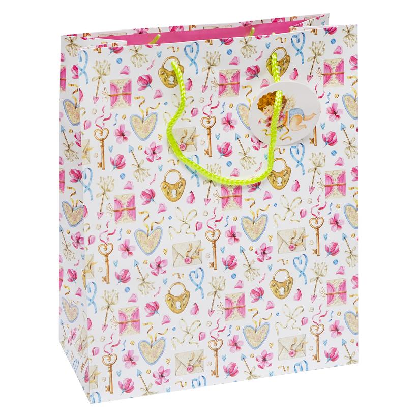 Подарочный пакет размером 26х32х12 см. Ручки выполнены из цветного полипропиленового шнурка диаметром 5 мм с наконечником-клипсой.