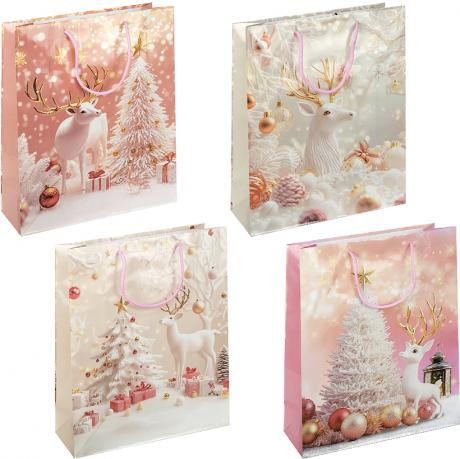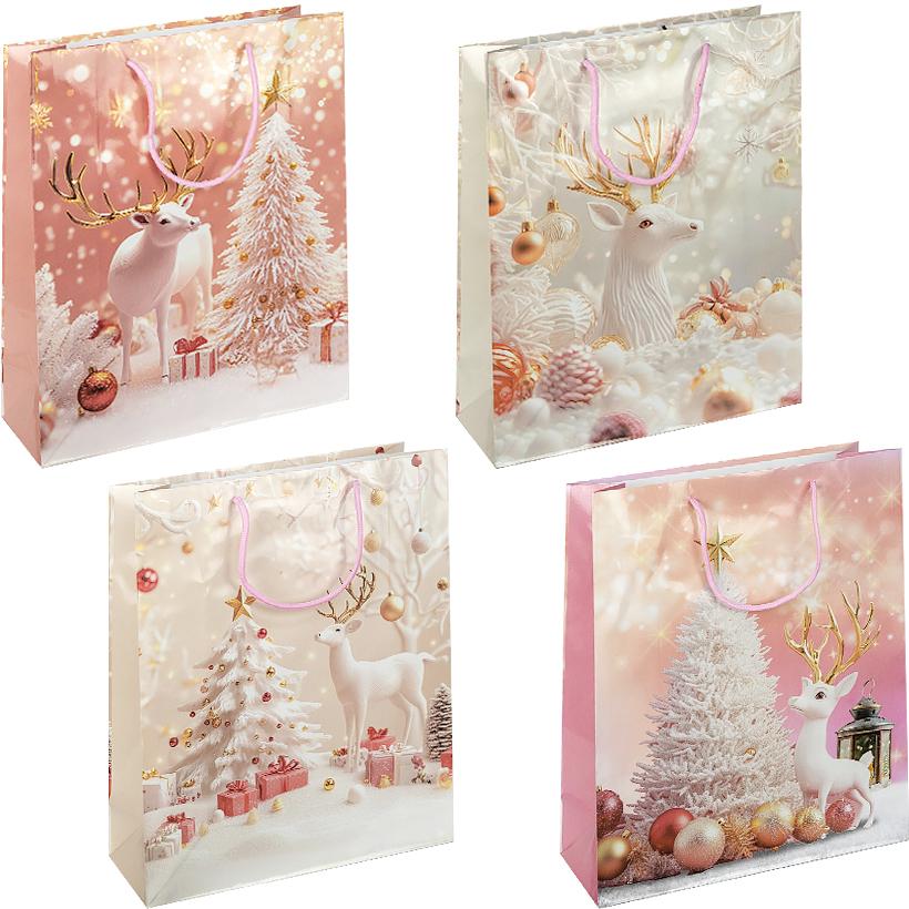 Подарочный пакет размером 32×44×11 см — стильная и нежная упаковка для праздничных подарков. Изготовлен из плотной ламинированной бумаги с глянцевым блеском, устойчива к влаге и повреждениям. Украшен зимними сюжетами с белыми оленями, ёлками и праздничными шарами в мягких пастельных тонах. В наборе 12 штук (4 разных дизайна). Пакеты оснащены прочными атласными шнурковыми ручками для удобства переноски. Подходят для упаковки подарков, сувениров и декора к Новому году.
