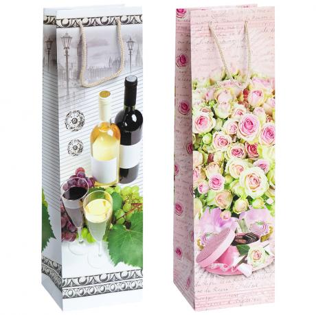 Цветной пакет "Бутылка" с глянцевой поверхностью. Размер 12х39х9 см. Упаковка содержит 12 штук. Ручки выполнены в виде шнурка. Цвета в ассортименте.