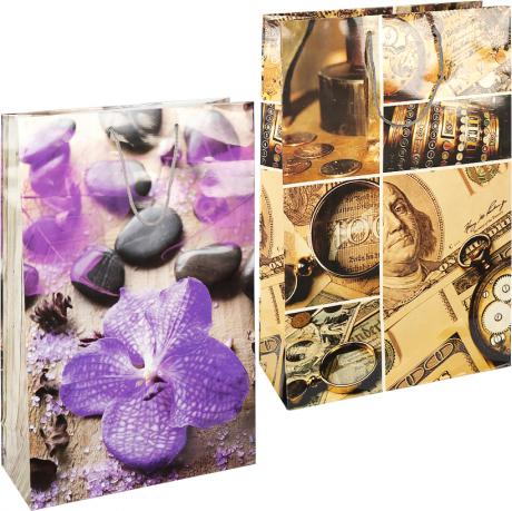 Цветной вертикальный пакет размером 45х30х12 см. Имеет ручки-шнурки. В упаковке 12 штук.
