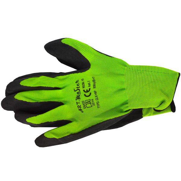 Перчатки рабочие зеленые с черным обливом. Материал: текстиль и нитрил. 12 пар в упаковке
