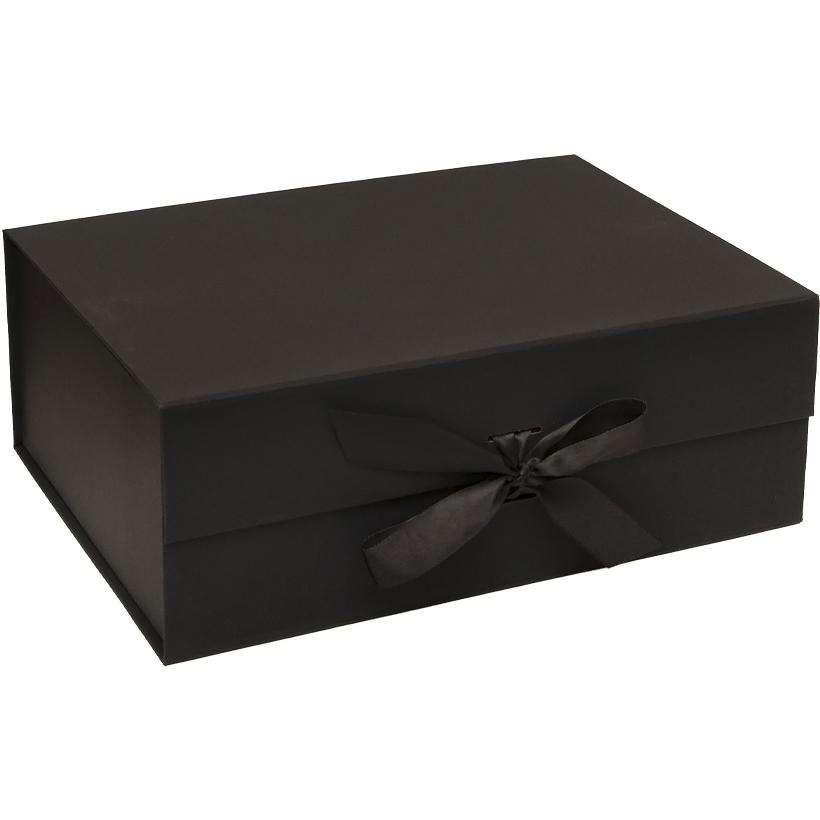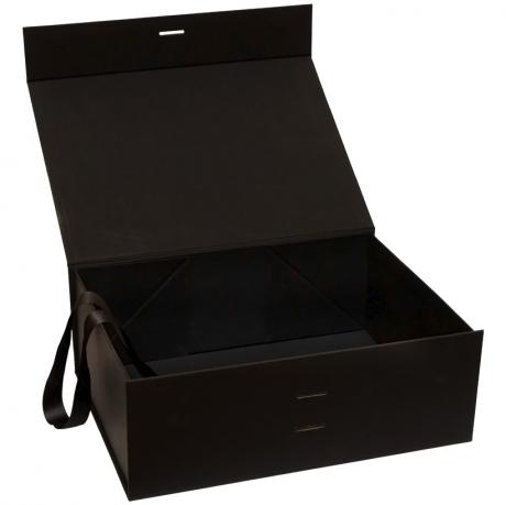 Подарочная складная коробка с лентой предназначена для оформления подарков и презентационной упаковки. Размер в собранном виде — 28,2×20,2×9,2 см. Размер в упаковочном пакете — 38×28,3 см. Коробка черного матового цвета. Крышка фиксируется с помощью магнитов и дополнительно оформлена лентой, которая аккуратно продевается через специальные отверстия и соединяет крышку с коробкой, обеспечивая надёжное закрытие и аккуратный внешний вид. Конструкция складная, углы фиксируются с помощью уже нанесённой двусторонней клейкой ленты, что обеспечивает прочность формы и удобство сборки. Товар выгодный для оптовых магазинов и подходит для розничной продажи.