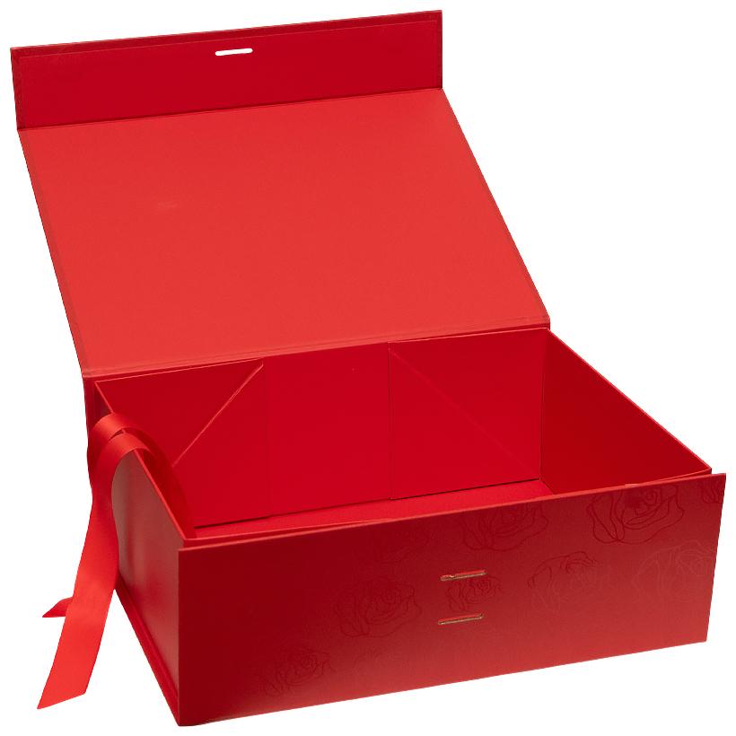 Подарочная складная коробка с лентой предназначена для оформления подарков и презентационной упаковки. Размер в собранном виде — 33×25×12 см. Размер в упаковочном пакете — 48.3х33 см. Коробка красного матового цвета, поверхность украшена УФ-печатным принтом с высокой стойкостью к износу. Крышка фиксируется с помощью магнитов и дополнительно оформлена лентой, которая аккуратно продевается через специальные отверстия и соединяет крышку с коробкой, обеспечивая надёжное закрытие и аккуратный внешний вид. Конструкция складная, углы фиксируются с помощью уже нанесённой двусторонней клейкой ленты, что обеспечивает прочность формы и удобство сборки. Товар выгодный для оптовых магазинов и подходит для розничной продажи.