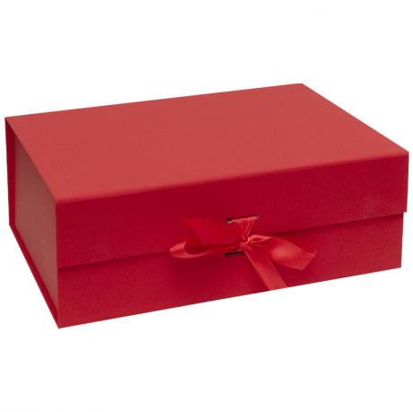 Подарочная складная коробка с лентой предназначена для оформления подарков и презентационной упаковки. Размер в собранном виде — 28,2×20,2×9,2 см. Размер в упаковочном пакете — 38х28 см. Коробка красного матового цвета. Крышка фиксируется с помощью магнитов и дополнительно оформлена лентой, которая аккуратно продевается через специальные отверстия и соединяет крышку с коробкой, обеспечивая надёжное закрытие и аккуратный внешний вид. Конструкция складная, углы фиксируются с помощью уже нанесённой двусторонней клейкой ленты, что обеспечивает прочность формы и удобство сборки. Товар выгодный для оптовых магазинов и подходит для розничной продажи.