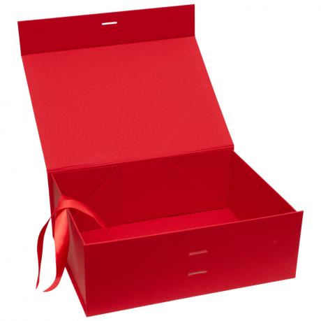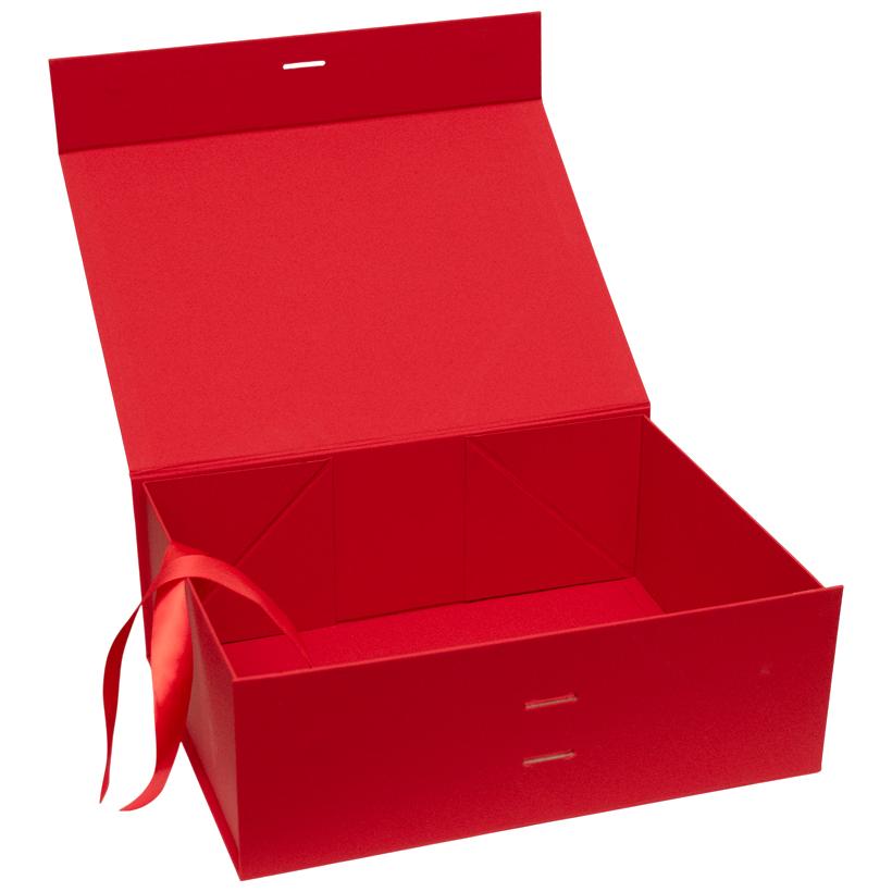 Подарочная складная коробка с лентой предназначена для оформления подарков и презентационной упаковки. Размер в собранном виде — 33×25×12 см. Размер в упаковочном пакете — 48,8×33 см. Коробка красного матового цвета. Крышка фиксируется с помощью магнитов и дополнительно оформлена лентой, которая аккуратно продевается через специальные отверстия и соединяет крышку с коробкой, обеспечивая надёжное закрытие и аккуратный внешний вид. Конструкция складная, углы фиксируются с помощью уже нанесённой двусторонней клейкой ленты, что обеспечивает прочность формы и удобство сборки. Товар выгодный для оптовых магазинов и подходит для розничной продажи.