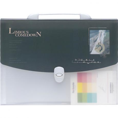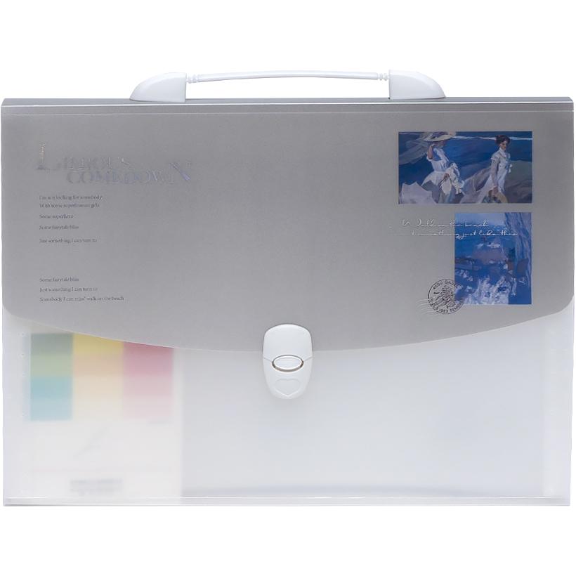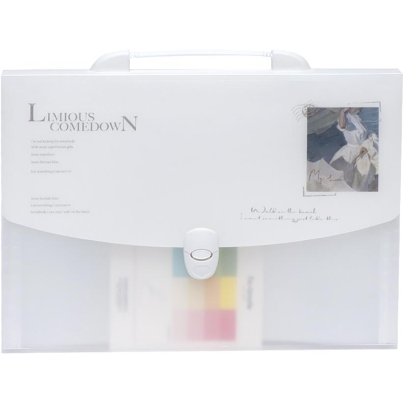 Это пластиковый портфель формата А4 с 12 отделениями. Он оснащен ручкой для удобства переноски. Цвет изделия - белый. Размеры портфеля составляют 330х240 мм.