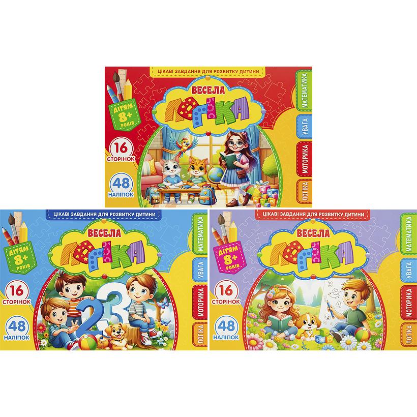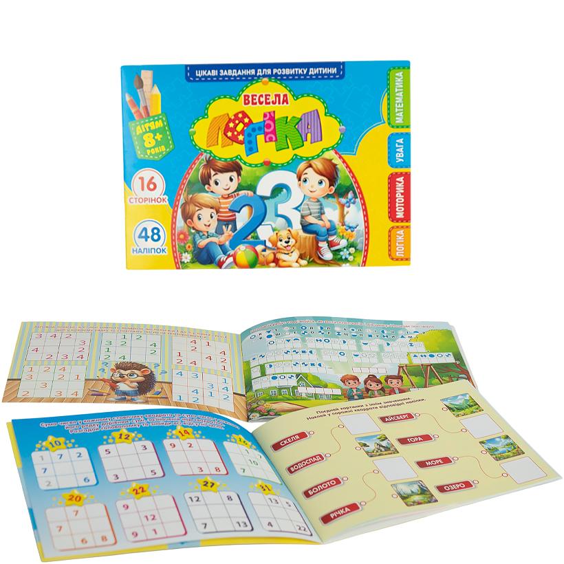 Книга Весёлая логика — универсальное развивающее пособие для детей от 8 лет. Содержит 16 страниц с увлекательными заданиями на развитие логики, внимания, моторики и математических навыков, а также 48 ярких наклеек. Формат 210×148 мм. Книга помогает тренировать мышление и развивать интеллект ребёнка в игровой форме, подходит для самостоятельных занятий дома или в школе.