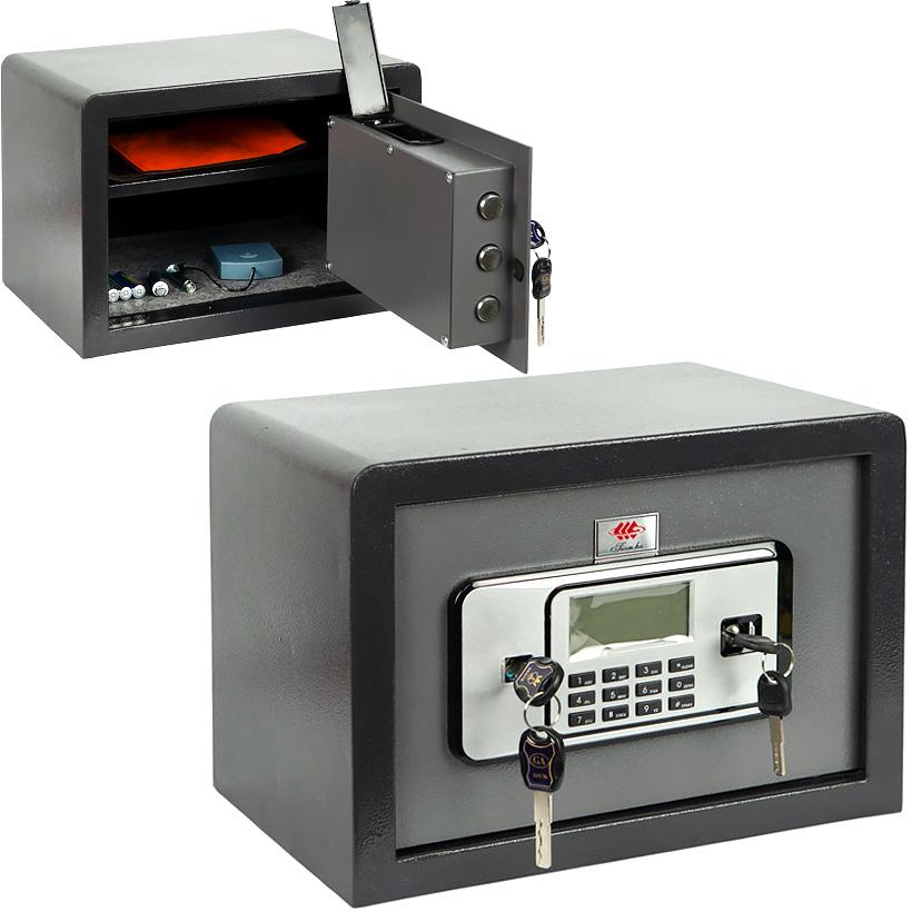 Электронный сейф с дисплеем и цифровым кодом — надёжный и вместительный сейф для хранения денег, документов и ценных вещей дома, в офисе или магазине. Совмещает удобство цифровой клавиатуры и дополнительную защиту с помощью аварийного ключа. Информационный экран отображает дату, состояние батареи и подтверждение ввода.