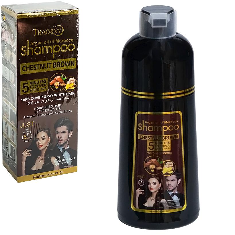 Шампунь-краска Thao&WY Argan Oil of Morocco Plant Series — инновационное средство для быстрого окрашивания волос всего за 5 минут. Формула с аргановым маслом глубоко питает и укрепляет волосы, придаёт мягкость, блеск и защищает от пересушивания. Полностью закрашивает седину, восстанавливает структуру и делает волосы более эластичными. Подходит для всех типов волос. Объём: 500 мл. Удобен в использовании, не требует дополнительных инструментов. В комплекте идут перчатки.