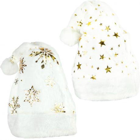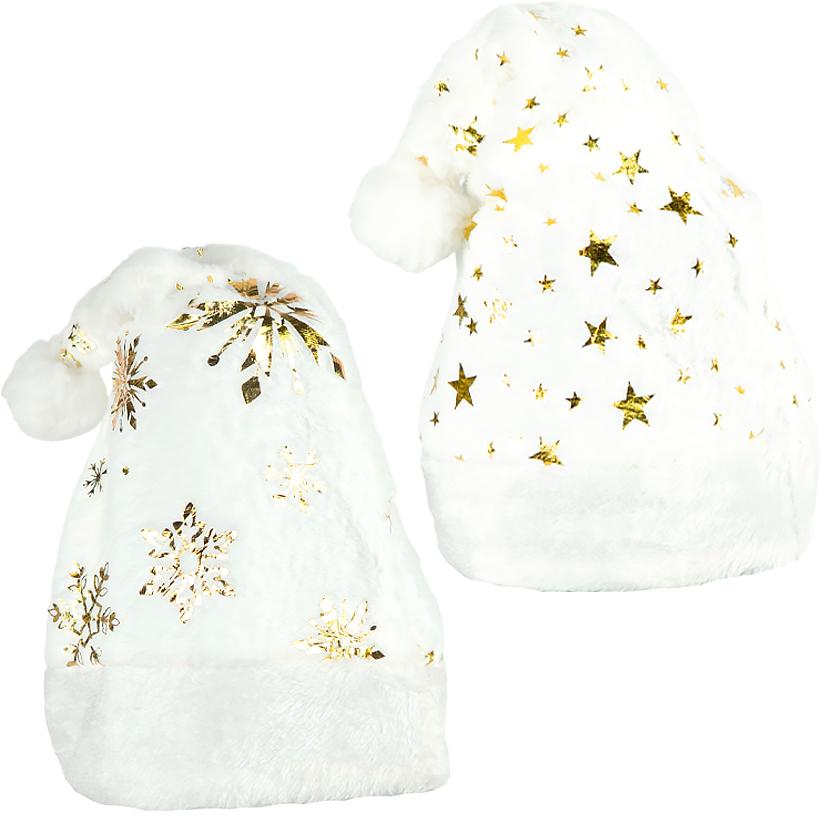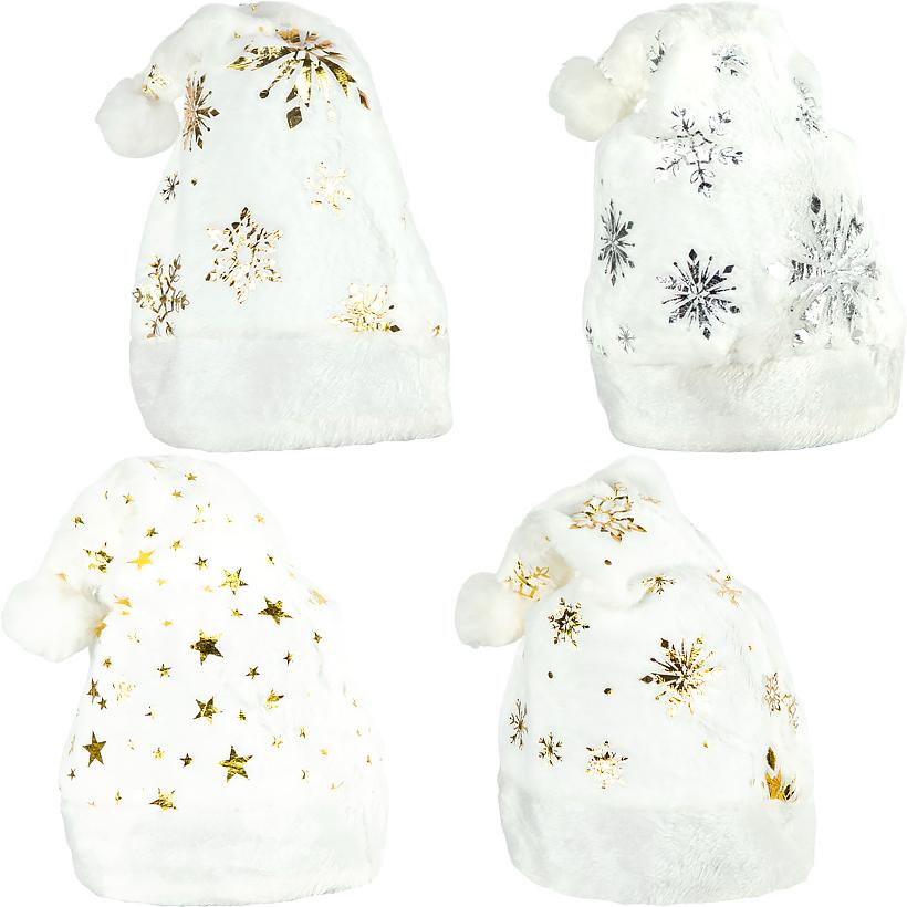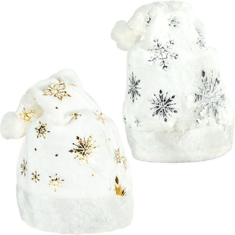 Новогодняя шапка белого цвета с мягкой меховой окантовкой и помпоном. Украшена блестящими серебристыми узорами, которые придают ей праздничный и элегантный вид. Выполнена из приятного на ощупь материала, комфортно сидит на голове. Обхват — 60 см, длина — 47 см. Идеально подходит для новогодних мероприятий, корпоративов и фотосессий.