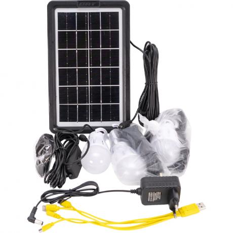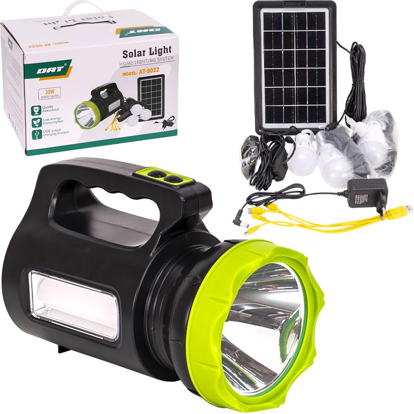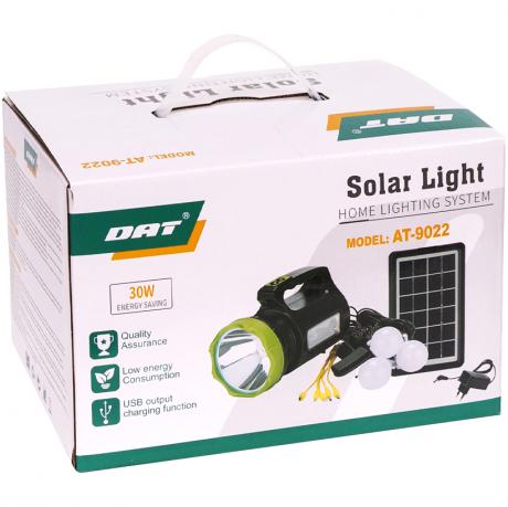 Переносная солнечная электростанция AT-9022 включает солнечную панель 6V-3,5W, кабель и три лампочки 5V-3W с проводами. Комплект проводов позволяет одновременно заряжать несколько устройств. Лампа и боковой светильник имеют три режима свечения. Размер электростанции составляет 25х16х18 см.