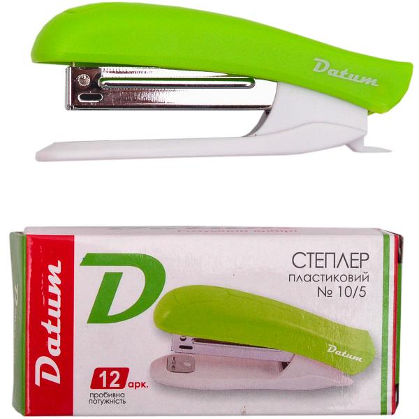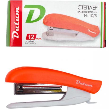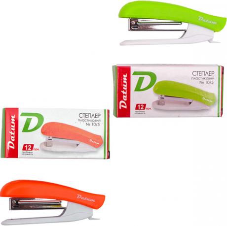 Скоба №10/5, количество скрепляемых листов: 12. Глубина сшивания: 50 мм Корпус выполнен из ударопрочного ABC пластика, рабочие механизмы выполнены из качественного металла. Оснащен антистеплером Уп.-1/12/288. Цвет — зеленый, оранжевый.